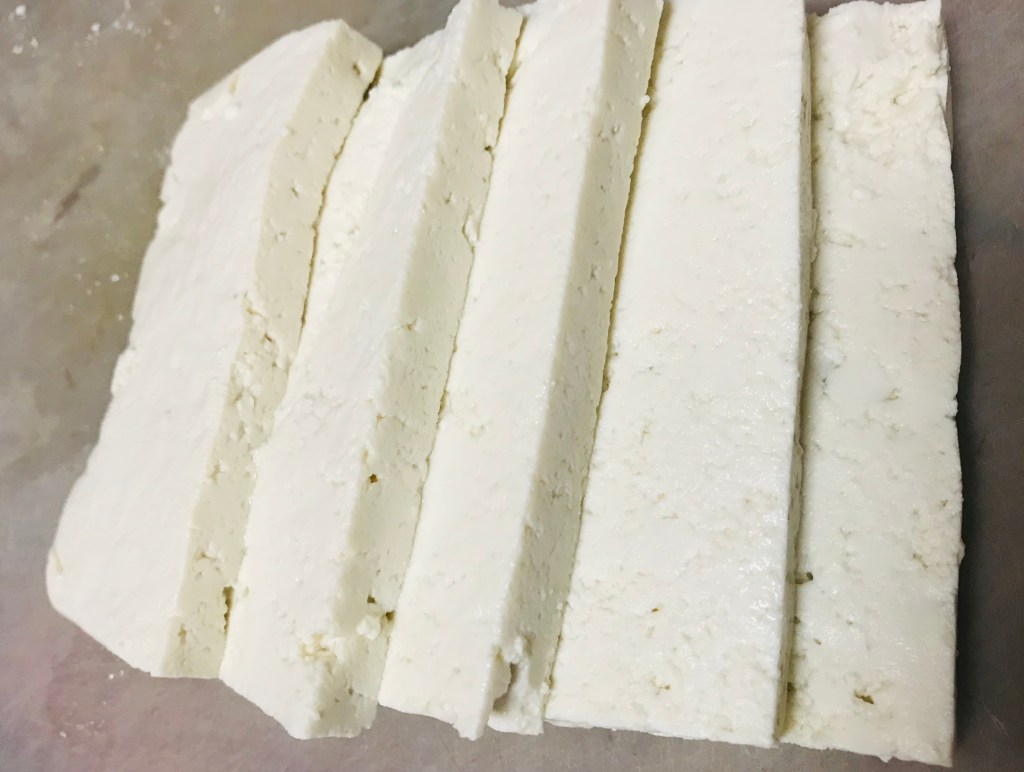 1) For you tofu newbies, remove the tofu from the pack and pour off the water. Take the block cut it in half. Put the half you aren’t using, in an air-tight container with new water, and toss it back in the fridge.