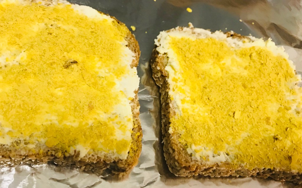 4) I mean, you know how to make toast, right? Stick that bread in the toaster. When it’s done, spread on your vegan butter and dust with nutritional yeast. Optional: Sometimes I opt to butter and dust the bread THEN put it under the broiler. Gives some nice crispy edges, although sometimes yields a soggier bread. Good news — you choose!