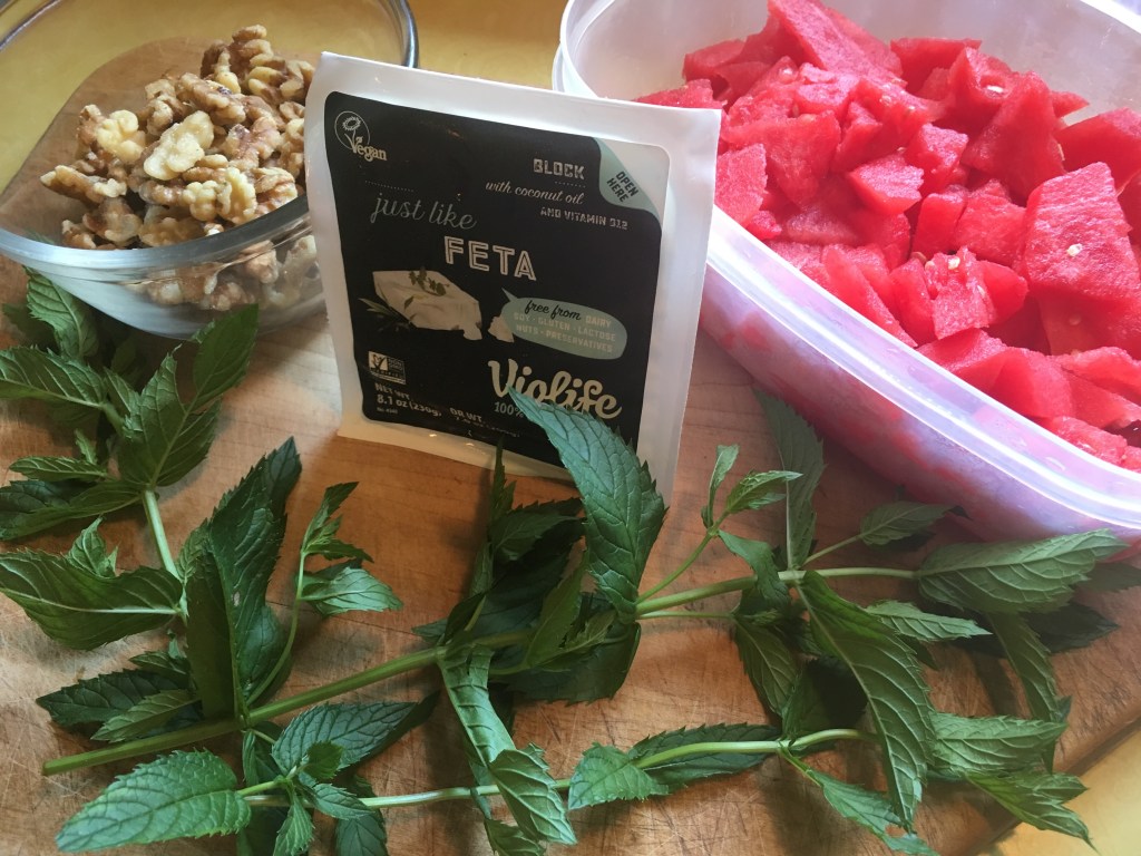 Note: I realize that 3/4 of a watermelon isn’t what we normally go out to the store to buy. But that’s what you’ll need to balance 1 package of Violife Feta. So go ahead and cut some up for the kids – yourself included – and “dish” that out, “stirring” up some anticipation while you “whip” up the rest. (I know – don’t give up my day job. Problem is with the Pandemic, I don’t have one. You’re stuck with me!)
