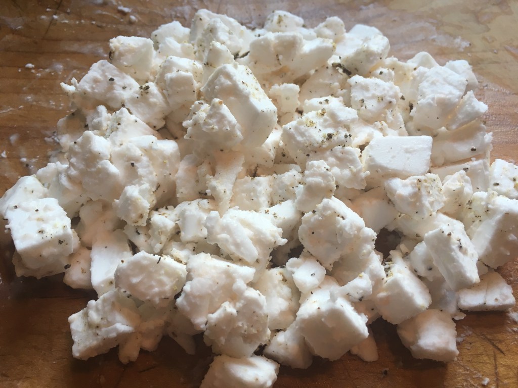 2.) Cut the whole Violife Feta Style package into 1/4 – 1/2″ pieces